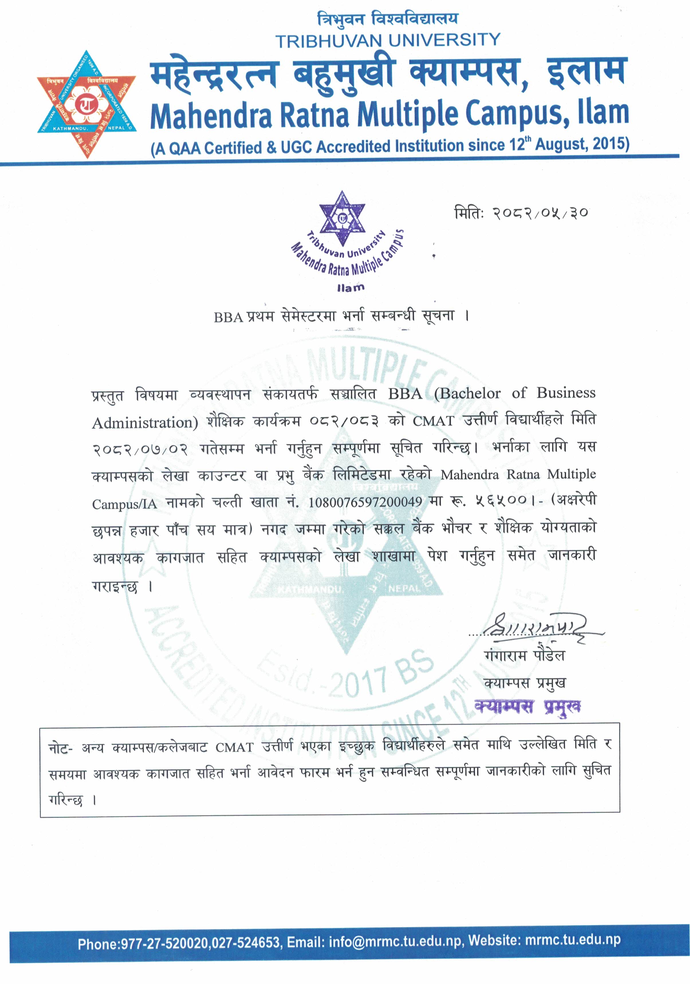 BBA प्रथम सेमेष्टरमा भर्ना हुने सम्बन्धी सूचना ।